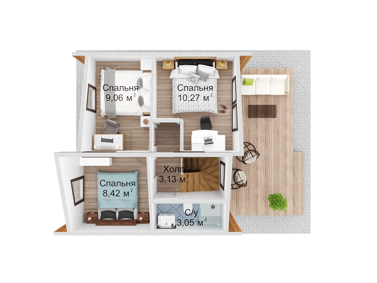 Технология строительства: .Каркасный Мансарда: Да Габариты дома: 7,5*6 Площадь: 64Жилая площадь: 51.36 Этаж: 2 Количество комнат: 3 Количество санузлов: 1