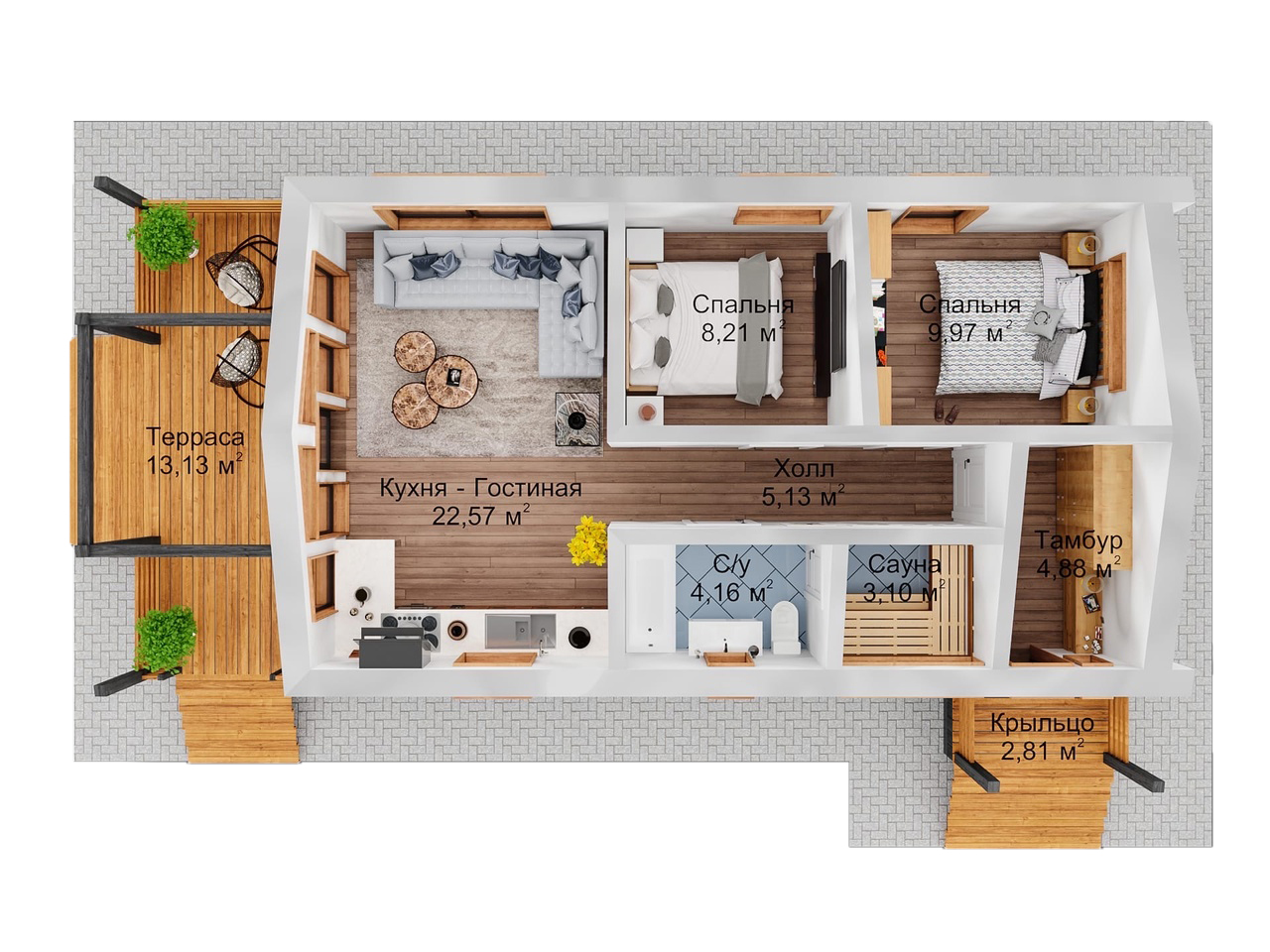 Технология строительства: .Каркасный Мансарда: Да Габариты дома: 12,40*5,40 Площадь: 67Жилая площадь: 49.4 Этаж: 1 Количество комнат: 1 Количество санузлов: 1